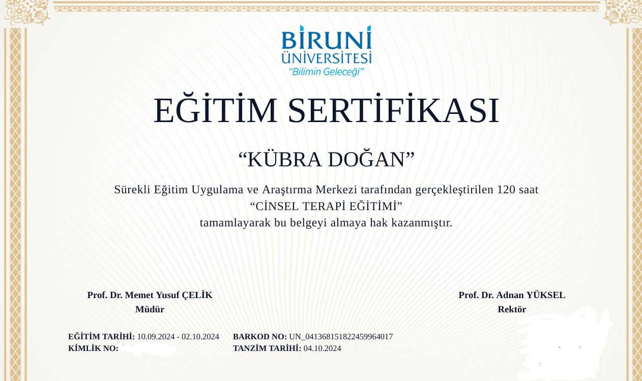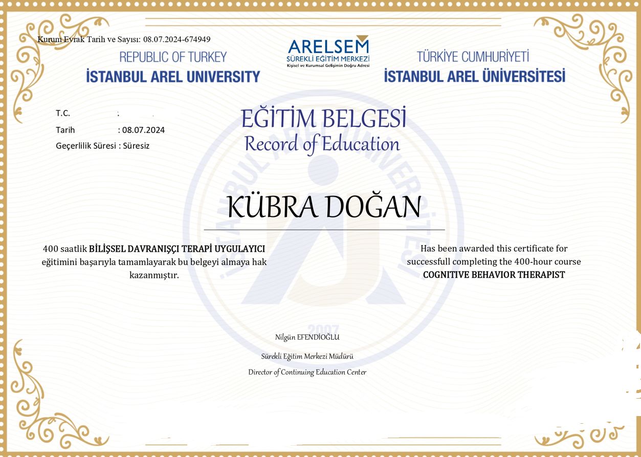 Mesleki gelişimime katkı sağlamak için birçok eğitim ve sertifika programına katıldım. İstanbul Arel Üniversitesi’nde Aile Danışmanlığı ve Bilişsel Davranışçı Terapi uygulayıcı eğitimlerimi tamamladım. Ayrıca Cinsel Terapi, Oyun Terapisi, Moxo Dikkat Testi, Objektif Testler, Aile ve Sosyal Yaşam Danışmanlığı gibi alanlarda belgelerim bulunmaktadır. Çocuklarla dikkat ve odaklanma becerilerini geliştirmeye yönelik Attentioner – Dikkatimi Topluyorum Programı eğitimi alarak uygulayıcı oldum.